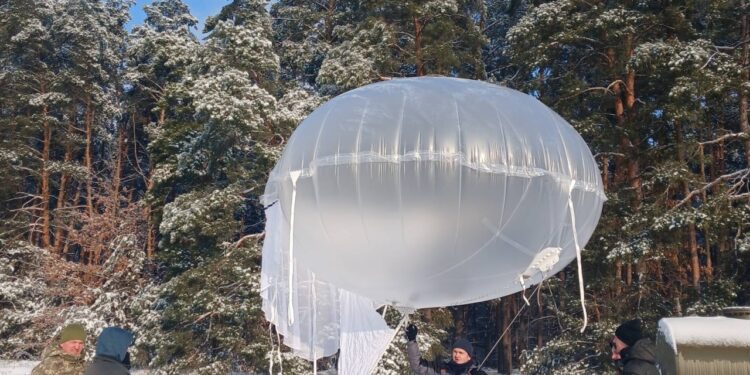 MILITARY TECHNOLOGY—In the skies above Ukraine, a new era of warfare is unfolding. Military balloons, once a relic of the past, have made a surprising comeback. These high-altitude balloons are now being used as long-range drone-launchers, extending the reach of Ukrainian attacks and American surveillance. The scene is set in a undisclosed location, where a team of Ukrainian soldiers carefully prepare a balloon for launch, its payload a state-of-the-art drone designed to gather crucial intel on enemy positions.