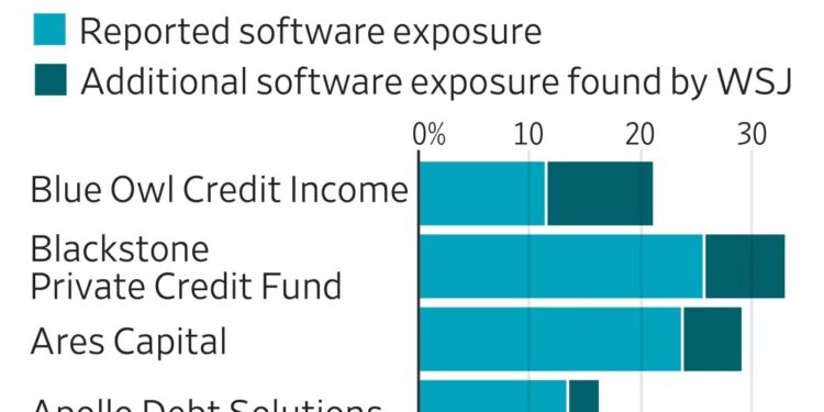 PRIVATE CREDIT—Private‑credit investors thought they were insulated from the volatility that haunts public‑equity software stocks. The reality, revealed by a recent WSJ analysis, shows that four of the industry’s biggest funds—Apollo Global Management, Ares Management, Blackstone and Blue Owl Capital—carry a far larger slice of the software pie than their prospectuses suggest.
